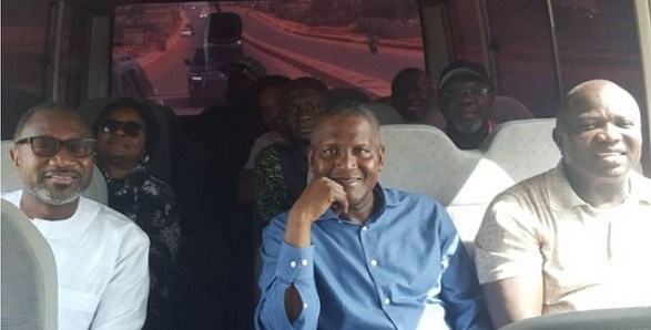 Nigerian billionaire, Femi Otedola, Governor of Lagos State, Akinwunmi Ambode and Africa’s richest man, Aliko Dangote have been spotted enjoying a bus cruise in Lagos.
